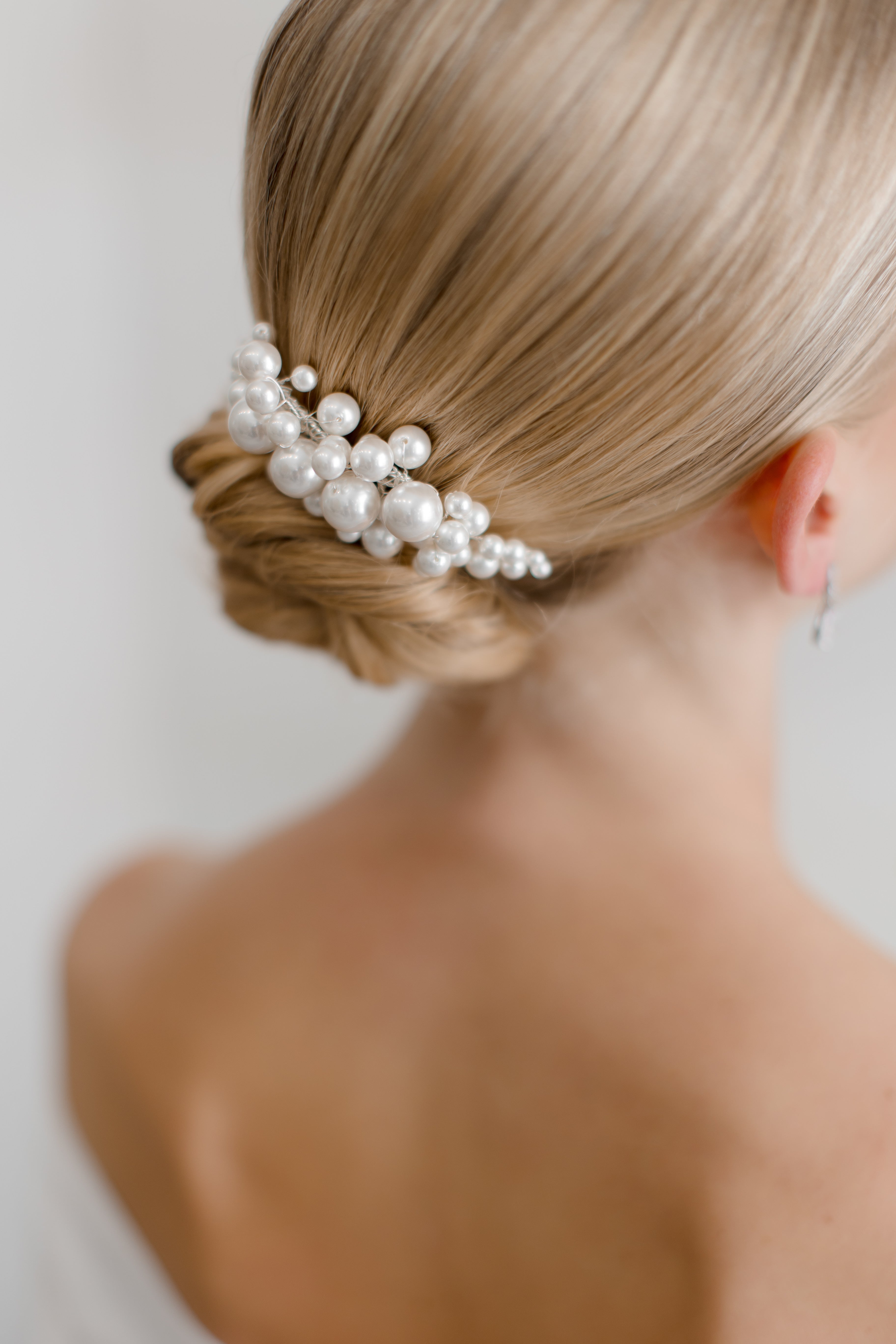 There are many ways to wear a bridal hair comb. With longer hair, you can use it to gently hold stray strands of hair in place, or wear it above a hair bun, or to accessorise a winding plait. For shorter hair, simply slide your hair comb into your hair where you want the decorative part to show. You can even use your bridal hair comb to disguise any bobby pins that are holding your hair securely in place.