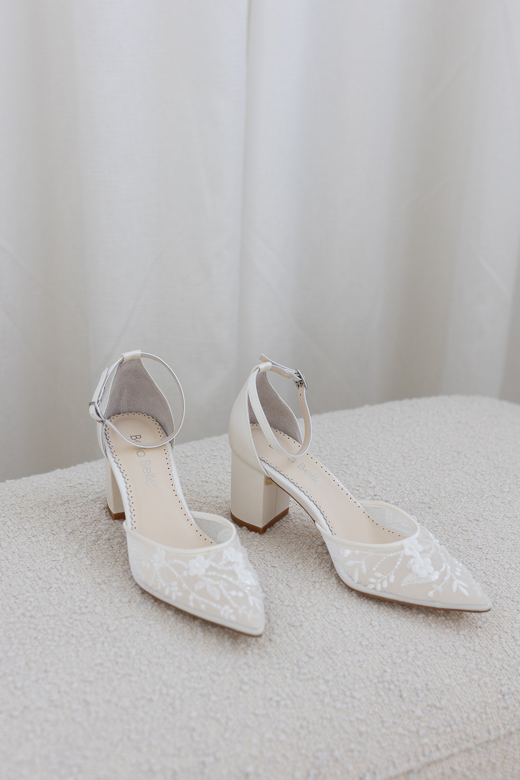 Thea - Floral Illusion Mesh Closed Toe Block Heels - Ivory