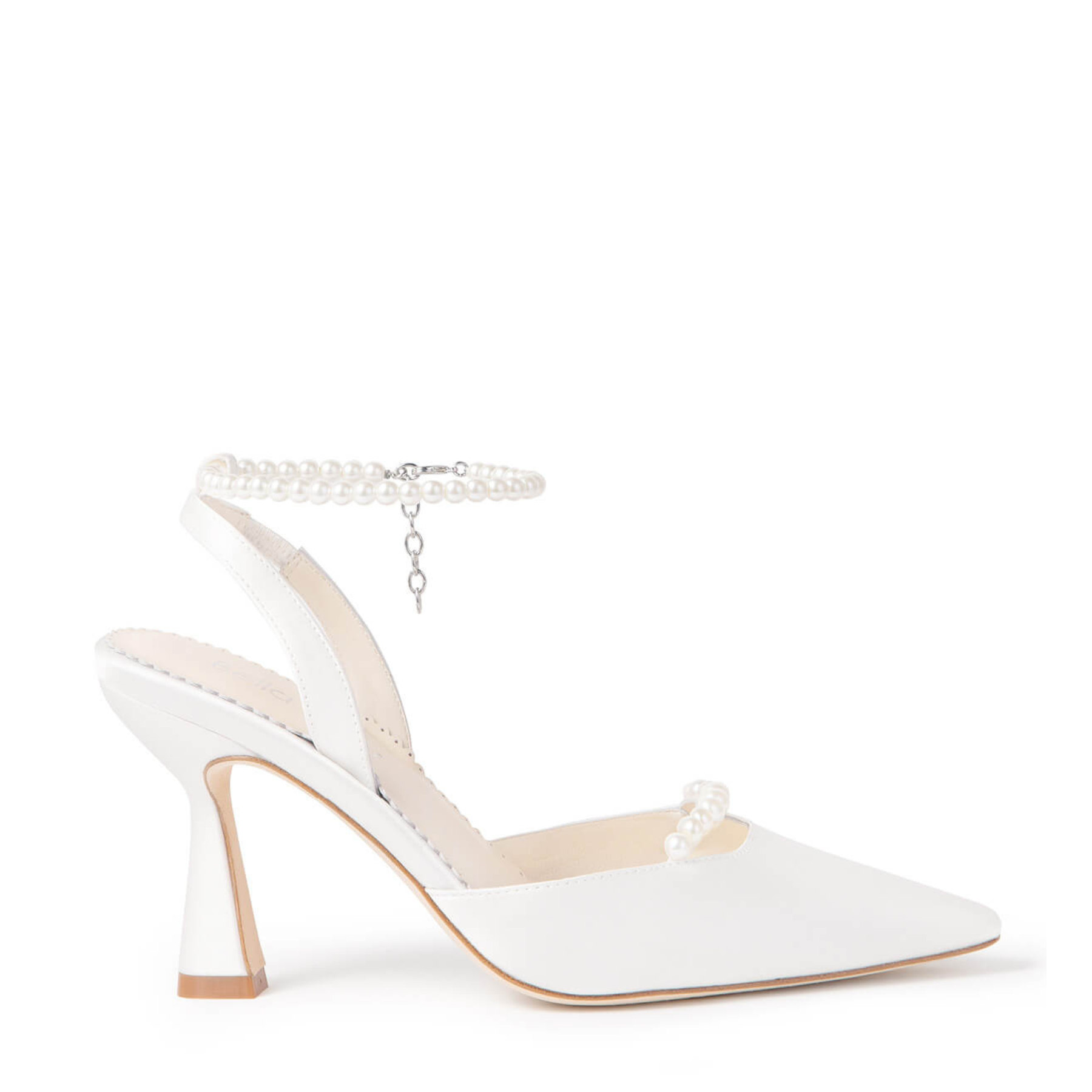 Destinee - Pointed Toe Satin Pumps with Pearl Strap - Soft White