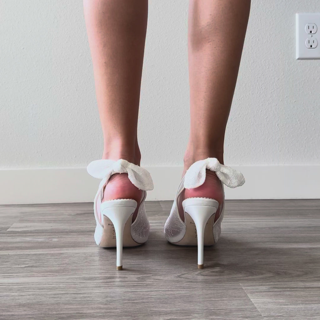 Monroe brings modern Hollywood elegance to a classic lace heel with a 3.5-inch stiletto, romantic lace bow, and leg-lengthening pointed toe. Crafted with breathable mesh and plush cushion-soft insoles, these slingback bridal heels blend sophistication with all-day comfort.